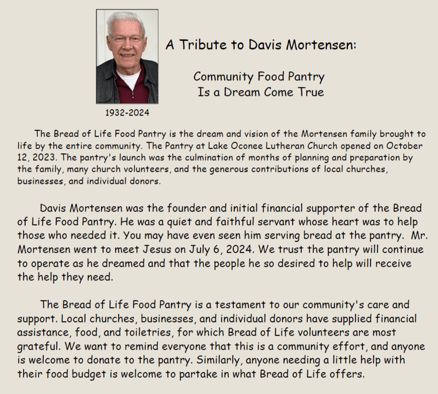 The Bread of Life Food Pantry opened October 12, 2023. As a Lake Oconee Lutheran Church (LOLC) ministry, the pantry is a non-profit 501c3 organization. The pantry operates as a drive-though service and is open to residents of, but not limited to, Greene, Putnam, and Morgan counties.